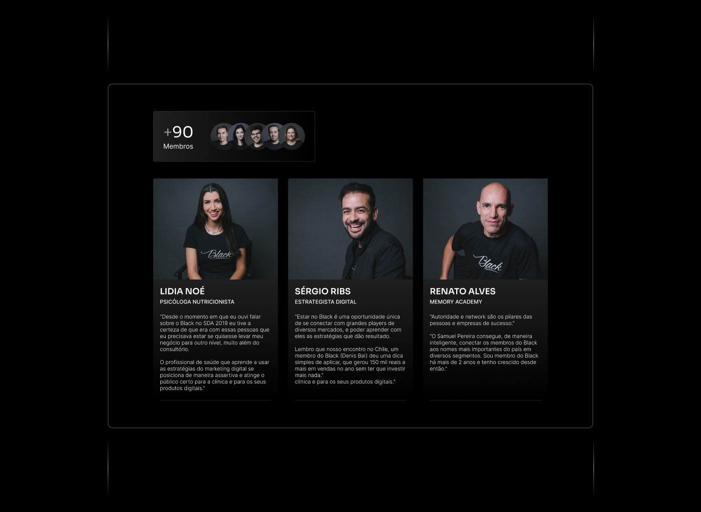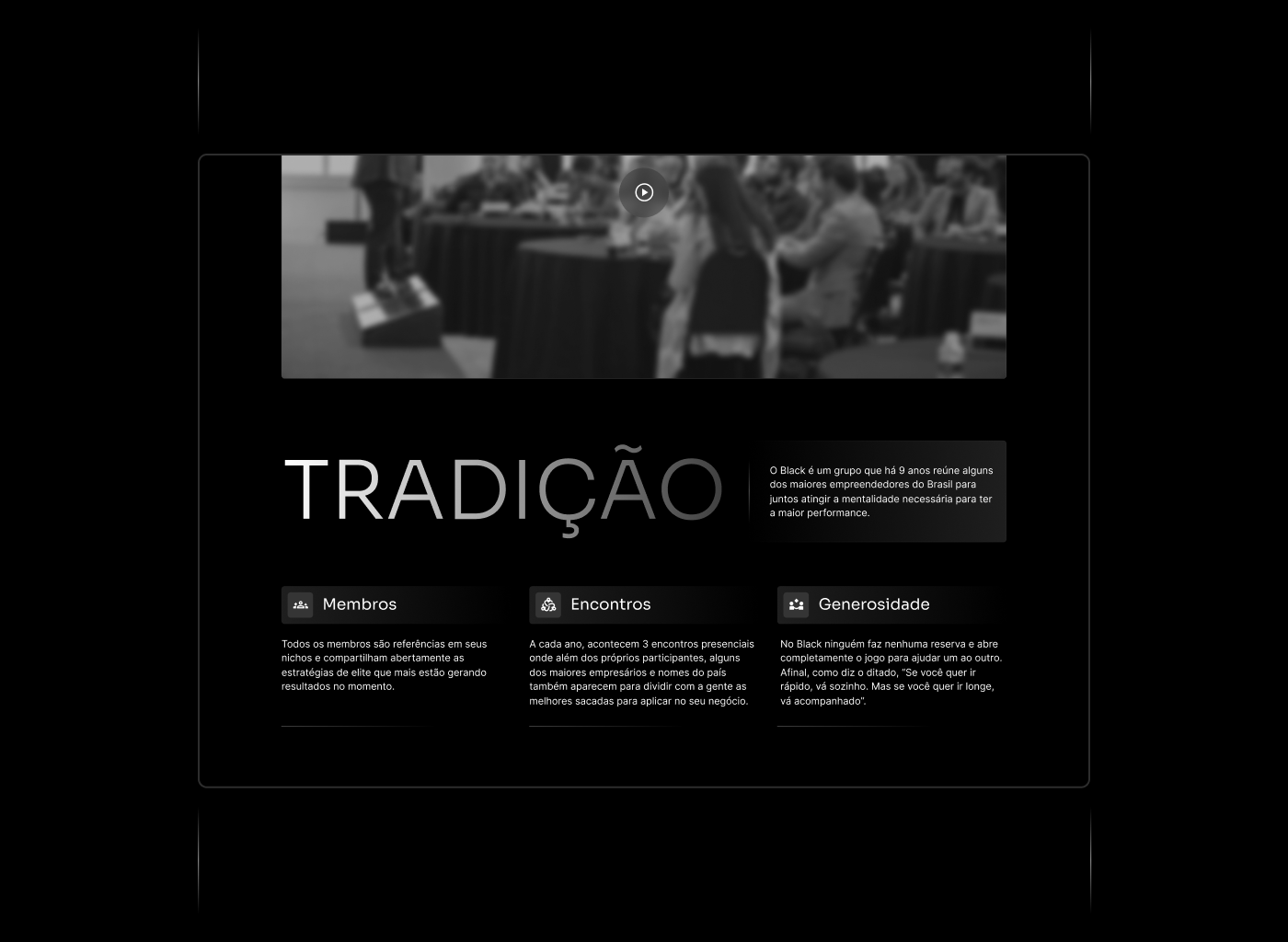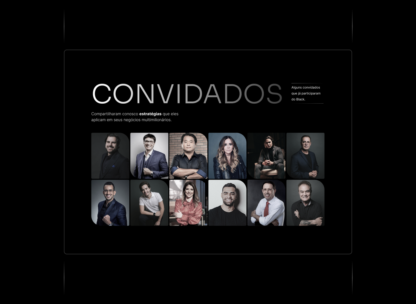 O Black é um grupo que reúne alguns dos maiores empreendedores do Brasil há 9 anos, com o objetivo de alcançar a mentalidade necessária para obter a maior performance. Um grupo de empreendedores unidos pode até mesmo transformar um país inteiro! O Black é formado por pessoas que vão além!